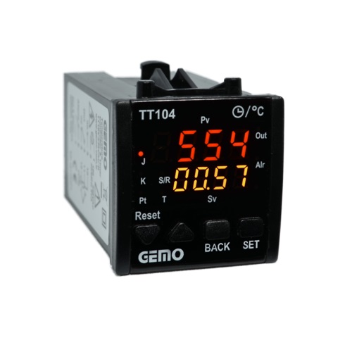 Bộ điều khiển nhiệt độ PID tích hợp TIMER TT104-230VAC-R của hãng GEMO - TURKEY là bộ điều khiển nhiệt độ có kích thước 48x48 mm nhỏ gọn được sử dụng để điều khiển nhiệt độ trong các ứng dụng công nghiệp hoặc giám sát, điều khiển thiết bị khác bằng cách so sánh tín hiệu từ cảm biến với điểm đặt và thực hiện các phép tính theo độ lệch giữa các giá trị đó.