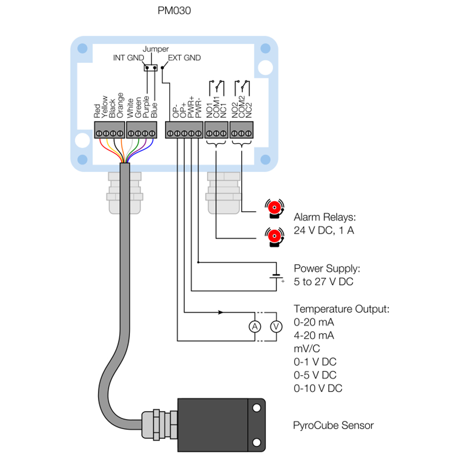 Khi cần cấu hình nâng cao, người dùng có thể kết nối cảm biến với màn hình PM030, cho phép thiết lập toàn bộ các tham số vận hành gồm lựa chọn dạng ngõ ra analog, điều chỉnh dải nhiệt độ xuất tín hiệu, cài đặt hệ số phát xạ, bù năng lượng phản xạ, cũng như lựa chọn chế độ báo động dạng cao, thấp hoặc băng tần. Màn hình hiện thị PM030 đồng thời cho phép theo dõi nhiệt độ theo thời gian thực, ghi dữ liệu dài hạn lên thẻ MicroSD, và quản lý lịch sử nhiệt độ trực quan dưới dạng đồ thị. Khi kết hợp cùng PM030, hệ thống được bổ sung hai ngõ relay báo động 24 VDC - 1 A, thích hợp để kích còi, đèn tín hiệu hoặc xuất cảnh báo sang PLC. Màn hình sử dụng giao diện lớn, đèn nền tự động chuyển sang màu đỏ khi xảy ra báo động và hỗ trợ ba ngôn ngữ gồm Anh, Trung giản thể và Nhật, giúp quá trình vận hành và giám sát trở nên thuận tiện hơn trong môi trường công nghiệp.
