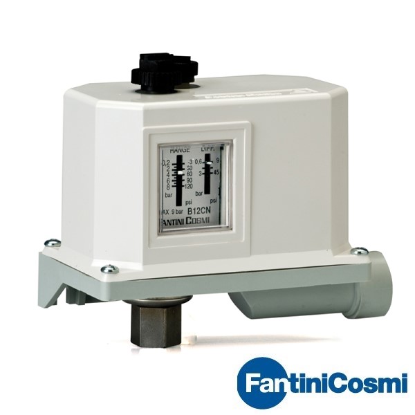 Công tắc áp suất nước B12DNY của Hãng FANTINI COSMI - ITALY hay còn gọi là công tắc báo quá áp suất gắn ống nước là sự kết hợp của bộ tiếp điểm đóng ngắt dạng relay với một cảm biến áp suất. Công tắc áp suất cho phép giám sát áp suất đường ống nước đến ngưỡng cài đặt, sau đó sẽ tác động relay đóng hoặc ngắt một thiết bị ngoại vi trên hệ thống như van xả, bơm, hệ thống tự động. Công tắc áp suất hoạt động hoàn toàn tự động theo ngưỡng cài đặt trước.