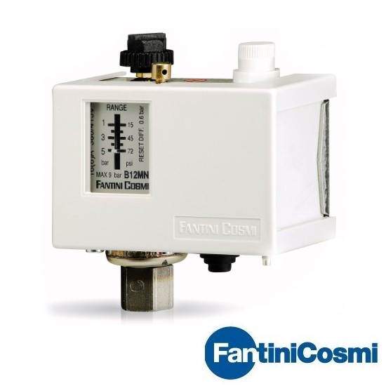 Công tắc áp suất nước B12MN của Hãng FANTINI COSMI - ITALY hay còn gọi là công tắc báo quá áp suất gắn ống nước là sự kết hợp của bộ tiếp điểm đóng ngắt dạng relay với một cảm biến áp suất. Công tắc áp suất cho phép giám sát áp suất đường ống nước đến ngưỡng cài đặt, sau đó sẽ tác động relay đóng hoặc ngắt một thiết bị ngoại vi trên hệ thống như van xả, bơm, hệ thống tự động. Công tắc áp suất hoạt động hoàn toàn tự động theo ngưỡng cài đặt trước.