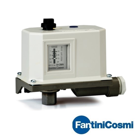 Công tắc áp suất nước B12MNY của Hãng FANTINI COSMI - ITALY hay còn gọi là công tắc báo quá áp suất gắn ống nước là sự kết hợp của bộ tiếp điểm đóng ngắt dạng relay với một cảm biến áp suất. Công tắc áp suất cho phép giám sát áp suất đường ống nước đến ngưỡng cài đặt, sau đó sẽ tác động relay đóng hoặc ngắt một thiết bị ngoại vi trên hệ thống như van xả, bơm, hệ thống tự động. Công tắc áp suất hoạt động hoàn toàn tự động theo ngưỡng cài đặt trước.