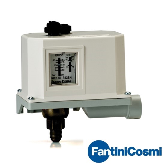 Công tắc áp suất nước B13BNY của Hãng FANTINI COSMI - ITALY hay còn gọi là công tắc báo quá áp suất gắn ống nước là sự kết hợp của bộ tiếp điểm đóng ngắt dạng relay với một cảm biến áp suất. Công tắc áp suất cho phép giám sát áp suất đường ống nước đến ngưỡng cài đặt, sau đó sẽ tác động relay đóng hoặc ngắt một thiết bị ngoại vi trên hệ thống như van xả, bơm, hệ thống tự động. Công tắc áp suất hoạt động hoàn toàn tự động theo ngưỡng cài đặt trước.