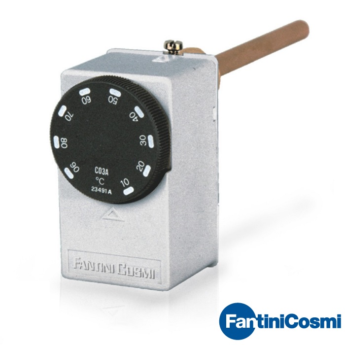 Công tắc nhiệt độ ống nước nóng C03B3 của Hãng FANTINI COSMI - ITALY hay còn gọi là công tắc báo quá nhiệt ống nước là sự kết hợp của bộ tiếp điểm đóng ngắt dạng relay với một đầu dò nhiệt độ. Công tắc nhiệt độ nước cho phép giám sát nhiệt độ đến ngưỡng cài đặt, sau đó sẽ tác động relay đóng hoặc ngắt một thiết bị ngoại vi trên hệ thống như máy bơm, van cấp, van xả. Công tắc hoạt động hoàn toàn tự động theo ngưỡng cài đặt trước.